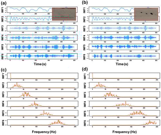 Finally, the termination condition was defined as the absolute mean square of the IMFs obtained from two consecutive iterations being less than 10−7. With an increase in iterations, VMD stopped proceeding when the termination condition was satisfied. The decomposed signals contained a series of IMFs with different frequencies. The spectral distribution could be acquired via Fourier transform.