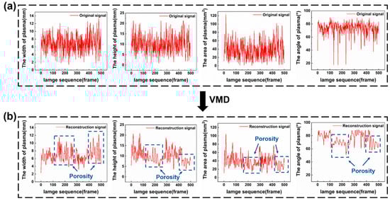 To correspond with the positions of the pores, it was necessary to arrange the plume images in chronological order and then extract the morphological signals, as described in Section 2.3.1. A total of 24 weld seams were obtained during the experiment, and 5000 plume images were collected in each weld seam. Figure 3 reflects the variation in laser plume morphology in 5000 images, representing for one weld seam. Upon the occurrence of keyhole-induced pores, the morphological signals fluctuated violently in a short segment. Specifically, the level of plume width increased, while that of the plume height, area, and angle decreased. The normal morphological signals of the laser plume slightly fluctuated due to the inevitable environmental noise, which had a negative impact on the recognition of pores. Therefore, the signals required decomposition to separate the defect signals from the original non-stationary plume signals.