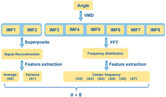 In summary, the set of the keyhole-induced pores features included both time-domain features and frequency-domain features. The frequency-domain features were the center frequencies of high-frequency components, and the time-domain features were the average and the variance of signals reconstructed by low-frequency components. The feature extraction method for angles is shown in Figure 6. The two low-frequency components were utilized to reconstruct the signals, and then the average and variance were extracted as time-domain features. The center frequencies of the remaining components were the six frequency-domain features. Therefore, the plume angle was extracted as eight features in total. Similar feature extraction was utilized for all morphological signals, and a total of twenty-six features were extracted in each signal sequence.