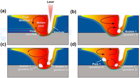 Figure 7 shows the representative processes of the keyhole-induced pore formation and migration [10,29]. During the laser welding, the location of the keyhole absorbed the most laser beam energy, and the metal vapored from there. Thus, the keyhole was a cavity filled with metal vaporization. The keyhole was opened continually during the normal welding process, as shown in Figure 7a. Once the keyhole was closed abnormally, the metal vapor was trapped in the molten pool and bubble 1 was formatted, as shown in Figure 7b. In addition, two vortexes in the contrary directions were formatted at the molten pool surface and bottom because of the molten metal flow, as shown in Figure 7a. With the violent clockwise vortex at the molten pool bottom, bubble 1 overcame the obstacle of viscosity force and surface tension gradient and migrated from position 1 in Figure 7b to position 2 in Figure 7c and position 3 in Figure 7d. Due to the continuing solidification and movement of the solidification front, bubble 1 was trapped in position 3 and transformed into a keyhole-induced pore. In Figure 7c,d, the other bubble, bubble 2, was formed via a similar migration process. Therefore, the location of the keyhole-induced pore was different from the bubble’s initial formation position [30].