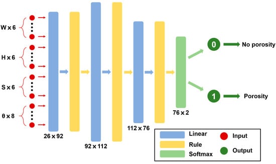 The prediction model was established by a BP neural network in this work. The generalization ability of BP neural network was strong, which meant the BP neural network was suitable to solve nonlinear prediction problem [31,32]. A three-layer neural network was established, as shown in Figure 8. The numbers of neurons in each hidden layer were 92, 112, and 76, respectively, which were proven to be the optimal network construction by repeated debugging. A total twenty-six features extracted by each signal segment were utilized as inputs. The output was set to 0 or 1 according to the actual weld picture; 0 represented no-porosity state, and 1 represented the porosity state.