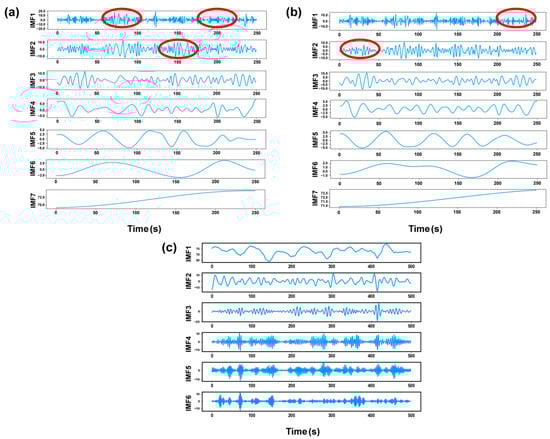 The time-domain waveforms of IMFs: (a) EMD; (b) EEMD; (c) VMD.