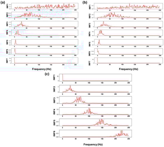 The frequency spectra of IMFs: (a) EMD; (b) EEMD; (c) VMD.