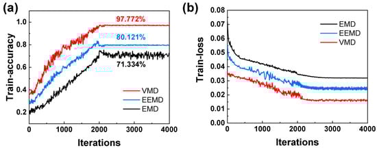 A regional prediction method with a signal segment length of 0.4 mm was selected as an example to demonstrate the training process. Figure 11 reflects the variation in accuracy and loss of the prediction model during the training process. The training process was divided into 20 epochs, with 200 iterations in each epoch and 4000 iterations. The accuracy variation in the training process is described in Figure 11a. For VMD, the accuracy increased rapidly from 35% to 83%, with iterations from 0 to 1500. The accuracy of the prediction model maintained a slight fluctuation after 2000 iterations. An accuracy of 97.77% was the maximum, with 2100 iterations in all training epochs. The accuracies of EEMD and EMD were 80.12% and 71.334%, respectively, which were much lower than VMD. To analyze the training process, the loss curve is displayed in Figure 11b. For VMD, the fast decreasing trendy from 0 iterations to 1500 indicated that the prediction model was optimized gradually. With 1500 to 2000 iterations, the violent fluctuating loss value indicated that the prediction process was trapped in a locally optimal solution. With 2000 iterations, the loss value decreased again, showing that the prediction model had escaped from the saddle point and was optimized again. When the iterations were increased to 2100, the loss value fluctuated in a small range, indicating that the optimal results were obtained. For EEMD and EMD, the trends of loss were similar to VMD. However, the loss of EEMD and EMD converged to 0.2349 and 0.03201, respectively.