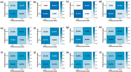 To verify the validity of the prediction model, an experiment was designed with the same welding parameters and conditions. The same feature extraction method as the training set was used to obtain laser plume features, and the network was used to predict weld porosity. To investigate the effect of different signal segment lengths on the prediction results, confusion matrixes were calculated, as shown in Figure 12. For VMD, the confusion matrixes are shown in Figure 12a–d. For EEMD, the confusion matrixes are shown in Figure 12e–h. For EMD, the confusion matrixes are shown in Figure 12i–l. Figure 12a showed a result of 0.2 mm signal segment, and the accuracy of prediction for pores was only 74.27%. The accuracy of the neural network was significantly improved by expanding the length of the signal segment. With a signal segment length of 0.4 mm, as in Fig. 12b, the porosity prediction accuracy was 90.82%. When the signal segment length was increased from 0.4 mm to 0.8 mm, the prediction accuracy for pores decreased from 90.82% to 81.14%. This indicated that the signal segment length was the key parameter affecting the accuracy. A better value of this parameter was 0.4 mm, containing 50 frames. For EEMD and EMD, it has been observed that the trends exhibited by varying the lengths of signal segments when generating confusion matrixes for both the EMD and EEMD showed a remarkable resemblance to that seen with VMD. Specifically, these analyses consistently indicated that a signal length of approximately 0.4 mm had a better performance. The mechanism of the effect of this parameter on the network accuracy is discussed in the following sections.