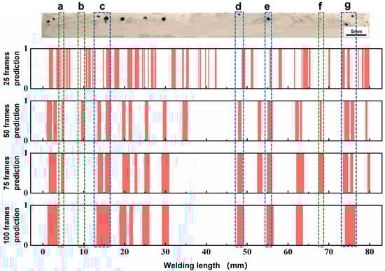 The result in Section 3.2 revealed that the optimal signal segment length was 0.4 mm, which contained 50 frames. When the length of the signal segment expanded from 50 frames to 100 frames, the accuracy of the neural network decreased. A significant difference for different signal segments occurred in predicting pores of different sizes. The prediction results based on different signal segments were correct for large pores (>0.3 mm in diameter). For pores less than 0.3 mm in diameter, such as positions a, b, and f in Figure 13, a signal segment with 50 frames could accurately find the pore location; however, a signal segment which contained 75 frames ignored some of them. When the signal segment length increased to 100 frames, the neural network was unable to recognize the small pores. In addition, unstable keyhole flow during welding induced the appearance of dense porosity at short distances, as shown at c and g in Figure 13. For the pores larger than 0.3 mm in diameter, such as positions d and e in Figure 13, a signal segment with 50, 75, and 100 frames could accurately find the pore location. The dense pores were separated precisely by the 50-frame signal segment. The prediction results of both 75- and 100-frame signal segments showed the presence of porosity in several continuous regions, which made the assessment of the weld quality difficult. Therefore, the regional prediction method based on a signal segment of 50 frames has advantages in the identification of small pores and the separation for dense pores, which led to optimal accuracy in pore prediction.