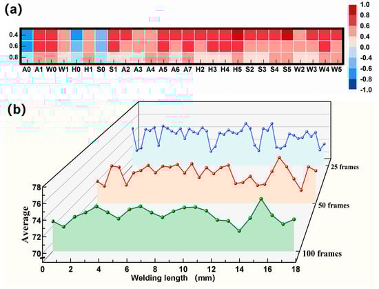 A weld seam from the verification set was intercepted from 1.5 mm to 21.5 mm for analysis, as shown in Figure 14. The weld seam contained the two types of porosity that caused the prediction deviations mentioned above. Considering the quality of the extracted features at different window lengths, the Spearman correlation coefficient was utilized to calculate the correlation between the different features and the label sequences. Figure 14a shows the distribution of the correlation coefficients, where all significance factors were less than 0.05. The vertical axis was the signal segment length, and the horizontal arrangement was the 26 features extracted from plume morphology, in which A meant the 8 extracted features formed an angle, W meant the 6 extracted features formed width, H meant the 6 extracted features formed height, and S meant the 6 extracted features formed area. It was found that the correlation between features and labels decreased as the window length increased. This situation was mainly caused by the dilution of features.