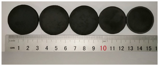 Figure 1 illustrates the macroscopic morphology of porous (Mo2/3Y1/3)2AlC ceramics obtained at different sintering temperatures. The sintering interval was 200 °C, and the sintering temperatures of the samples from left to right were 650 °C, 850 °C, 1050 °C, 1250 °C, and 1450 °C, respectively. As shown in Figure 1, the overall volume change of the samples displays different trends at different temperatures. Overall, as the temperature increased, the sample exhibited a significant trend of radial shrinkage. Specifically, the shrinkage was most significant from 1050 °C to 1250 °C, while the changes were not significant at 650 °C to 1050 °C and 1250 °C to 1450 °C. Additionally, the sample surfaces remained relatively flat and smooth, with some spots caused by carbon from the furnace adhering to the surface. Other than that, there were no protrusions or fractures.