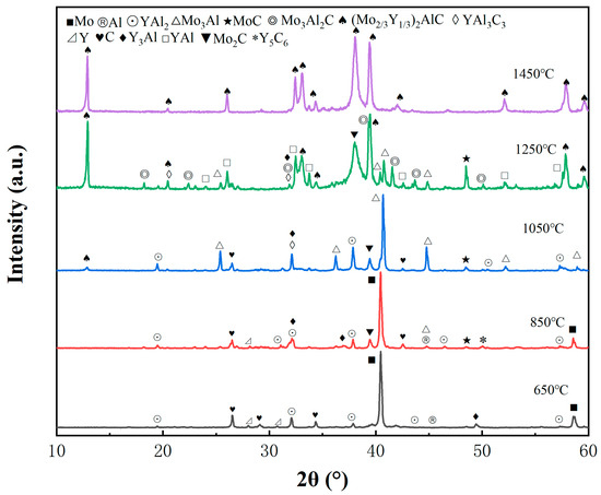 Except for the Mo, Y, Al, and C elements that did not fully react, Y gradually reacted with solid Al, generating a small number of YAl2 at 650 °C. Upon raising the sintering temperature i to 850 °C, there was a significant increase inYAl2, accompanied by the formation of intermetallic compounds such as Y3Al and Mo3Al, as well as the initial appearance of Mo2C and Y5C6 carbides. In the study by Yang et al. [19], it was found that Ti-C compounds have a lower enthalpy of formation compared to Ti-Al compounds, suggesting Ti-C compounds should theoretically form more readily. However, experimental results show that Ti-Al compounds are more easily observed. Similarly, in this experiment, when the temperature was raised to 850 °C, intermetallic compounds of Y-Al and Mo-Al were observed, with only a small amount of carbides present. As the sintering temperature further increased to 1050 °C, characteristic peaks of MAX phase appeared at low angles, indicating that a small amount of (Mo2/3Y1/3)2AlC had already been generated. As carbides such as Mo2C and MoC gradually increased, YAl2 also steadily increased. Moreover, the content of Mo3Al increased sharply, becoming the dominant phase at this temperature. Additionally, a small amount of Y-C compound began to slowly combine with Y-Al to form a new phase, YAl3C3.