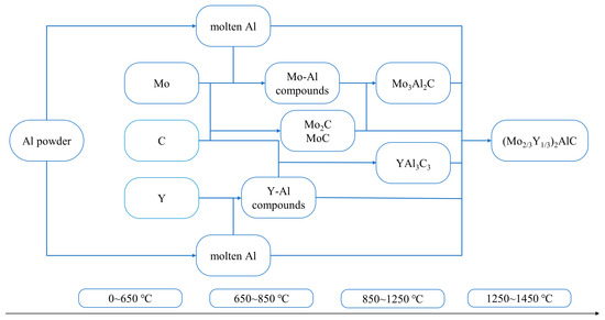 At the final sintering temperature of 1450 °C, pure phase (Mo2/3Y1/3)2AlC was successfully synthesized. Based on XRD analysis, the possible reaction pathways leading to (Mo2/3Y1/3)2AlC are as follows: