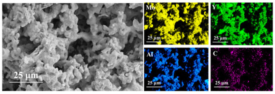 As mentioned in the previous analysis, 1250 °C is the critical temperature for the formation of porous (Mo2/3Y1/3)2AlC ceramics. Figure 5d exhibits that particle connections become more pronounced, and the surface gradually becomes smooth. In Figure 1, the sample volume shows significant shrinkage at the macro level, while at the micro level, Kirkendall pores become clear and visible. At a larger magnification, as shown in Figure 5f, it is evident that the particles are tightly bound and exhibit a distinct layered structure. Additionally, Figure 6 presents an EDS mapping map at the final sintering temperature of 1450 °C. The mapping shows that the distribution of each element is uniform, with no segregation, indicating that the raw materials were well mixed and the fusion between various elements was homogeneous after sintering.