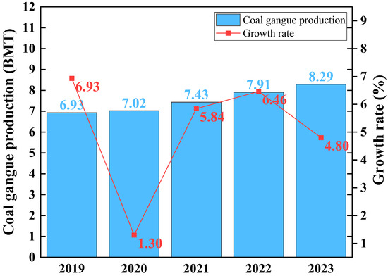 China’s annual coal gangue production and growth rate from 2019 to 2023.