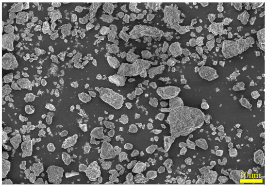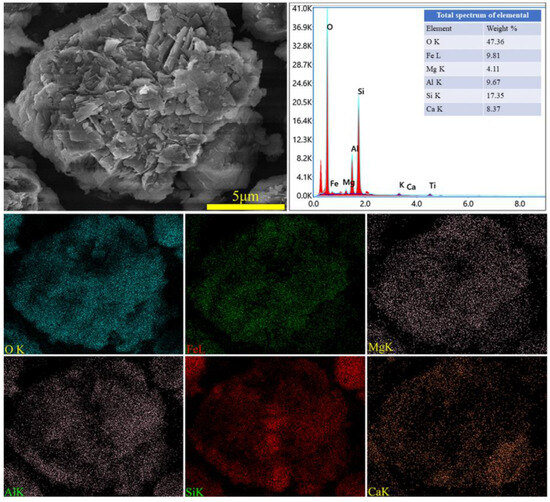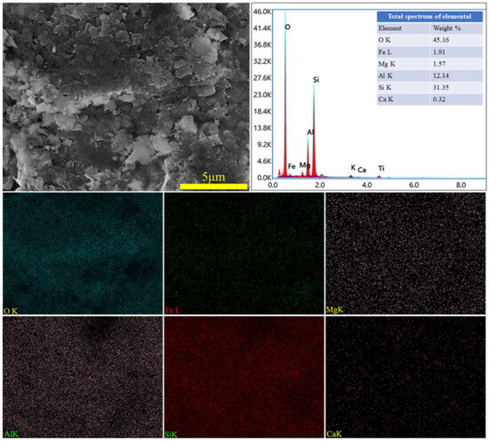 To ascertain the mineral composition and structural morphology of the coal gangue, a Japanese Rigaku Ultima IV X-ray diffractometer (XRD, Rigaku Company, Tokyo, Japan) and a German ZEISS Sigma 300 scanning electron microscope (FE-SEM, Carl Zeiss AG, Oberkochen, Germany) were used to conduct XRD, SEM, and SEM-EDS characterization analyses of the coal gangue samples. The XRD, SEM, and SEM-EDS spectra of the coal gangue samples are shown in Figure 2, Figure 3, Figure 4 and Figure 5, respectively. The XRD results indicate that the main mineral components of the coal gangue are quartz (SiO2) and kaolinite (Al4(Si4O10)(OH)6). The diffraction peaks of the quartz phase are sharp and clear, suggesting high crystallinity. Additionally, the coal gangue contains small amounts of clinoferrosilite (FeSiO3), siderite (FeCO3), and brookite (TiO2). The SEM results showed that the size distribution of coal gangue particles is uneven and shows an irregular morphology. The SEM-EDS point and area scan analyses of the coal gangue raw material are shown in Figure 4 and Figure 5, respectively. From Figure 4, it is evident that the coal gangue particles are formed by stacking lamellar crystals, exhibiting a typical layered structure. The Fe element is uniformly distributed within the coal gangue particles. The coal gangue is primarily composed of elements such as Si, Fe, Al, Ca, Mg, S, K, among others, which corresponds well with the analysis results in Table 1. From Figure 5, it can be observed that the combination and dispersion of O, Fe, Al, and Si are relatively uniform, consistent with the phase analysis results in Figure 2. The coal gangue is mainly composed of phases such as SiO2, Al4(Si4O10)(OH)6, and FeSiO3.