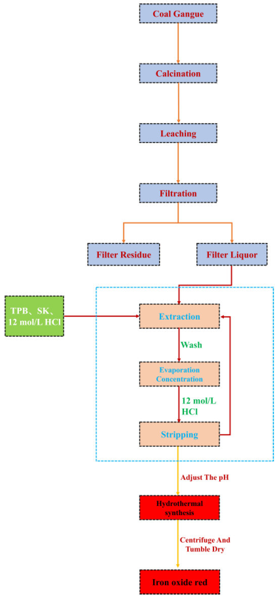 Process flowchart of iron red prepared by iron liquid extraction by coal gangue acid leaching.