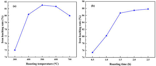 Effect of different roasting temperature (a) and roasting time (b) on iron leaching rate (acid leaching temperature of 70 °C, leaching time of 2 h, liquid—solid mass ratio of 4:1, and acid concentration of 6 mol/L).