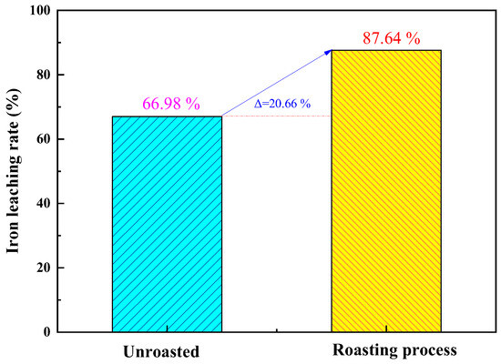 Under optimized roasting activation conditions, a comparative study was conducted to investigate the effects of unroasted and roasted activation on the iron removal rate of coal gangue. The results, as shown in Figure 8, indicate that the iron removal rate of unroasted coal gangue is 66.98%. Unroasted coal gangue exhibits a higher lattice structure and lower reaction activity. The iron removal rate of roasted activated coal gangue is 87.64%. Under high-temperature roasting, particles undergo intense thermal motion, causing ions such as Fe, Mg, and Ca to reselect filling positions and leading to the formation of short-chain, disordered, and unstable glassy and amorphous substances from silicon–oxygen tetrahedra and aluminum–oxygen octahedra. This greatly enhances the reaction activity [29]. Comparative experimental results demonstrate that the roasting activation of coal gangue contributes to an increased leaching rate of Fe.