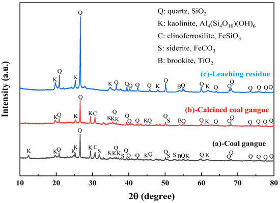 XRD patterns of coal gangue raw materials (a), calcined coal gangue (b) and leaching residue (c).