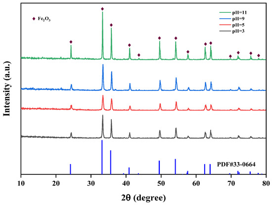 The effect of different pH values (pH = 3, 5, 9, 11) on the crystallinity of iron oxide red was studied at 150 °C and 5 h. The XRD spectra of iron oxide red under different pH conditions are shown in Figure 15. It can be observed from the graph that when the pH is 11, the diffraction peaks of Fe2O3 are sharper compared to other conditions, indicating that the crystallinity of Fe2O3 is highest at pH 11. In the hydrothermal synthesis of Fe2O3, pH is an important influencing factor. A higher pH leads to a faster hydrolysis of Fe3+ ions and a higher degree of hydrolysis, resulting in the higher purity of the prepared Fe2O3.