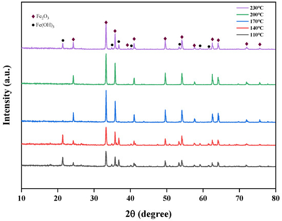 The effects of different temperatures (110 °C, 140 °C, 170 °C, 200 °C, 230 °C) on the crystallinity of iron oxide red were studied at pH 11 and a time of 5 h, and the XRD spectra of Fe2O3 at different hydrothermal temperatures are shown in Figure 16. From the figure, it is evident that at hydrothermal temperatures of 110 °C and 140 °C, the Fe(OH)3 phase appears. This is primarily due to the low temperature, where some of the Fe(OH)3 phase in the solution has not yet converted to the Fe2O3 phase. However, at 230 °C, the Fe(OH)3 phase reappears, possibly because the high temperature leads to rapid hydrolysis, causing Fe(OH)3 to enter the lattice without sufficient conversion. When the hydrothermal temperature is 170 °C and 200 °C, no Fe(OH)3 phase is observed, indicating that these temperature conditions are suitable for the transformation from the Fe(OH)3 phase to the Fe2O3 phase. From the perspective of energy conservation, 170 °C was chosen as the optimal hydrothermal temperature for subsequent experiments.