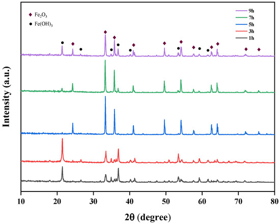 At an optimal temperature of 170 °C and pH value of 11, the effect of different durations (1 h, 3 h, 5 h, 7 h, 9 h) on the crystallinity of iron oxide red was investigated. The XRD spectra of iron oxide red under different hydrothermal durations are shown in Figure 17. It can be observed that with an increasing reaction time, both the Fe2O3 and Fe(OH)3 phases are present in the samples. However, as the reaction time extends, the intensity of the Fe(OH)3 phase noticeably decreases and its relative content gradually diminishes, indicating that a prolonged reaction time is conducive to purity enhancement. Nevertheless, when the hydrothermal time exceeds 5 h, the peak intensity of the Fe2O3 phase weakens, and concurrently, the appearance of the Fe(OH)3 phase begins. Therefore, the optimal hydrothermal duration for Fe2O3 phase generation is 5 h.
