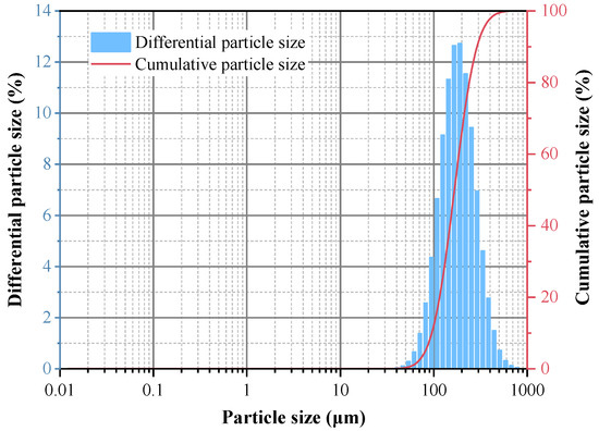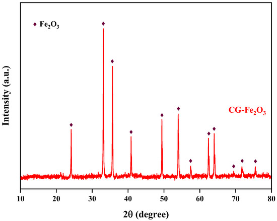 The preparation experiment for iron oxide red was carried out under the conditions of optimal reaction pH = 11, reaction temperature 170 °C, and a reaction time of 5 h, and the yield of iron oxide red was 80.07%. The XRD spectrum of the prepared iron oxide is shown in Figure 18. All the diffraction peaks of the sample correspond to the standard card of Fe2O3 and exhibit sharp peaks [33], indicating a high degree of crystallinity. Additionally, there are no other excess peaks observed in the diffraction peaks, indicating the high purity of the prepared Fe2O3. The particle-size distribution of iron oxide red is shown in Figure 19, ranging from 25 to 780 μm, with an average particle size of 167.16 μm. The cumulative volume of particles less than 200 μm is 61.95%, and that of particles less than 500 μm is 98.78%. ICP-OES was used for the elemental analysis of the iron oxide red samples. The analysis results are shown in Table 4. The purity of the iron oxide red prepared using coal gangue reached 99.16%, exceeding the purity standard (98.5%) required by the “Iron Oxide for Ferrite YHT4 Standard” (GB/T 24244-2009) [34], making it suitable as a raw material for producing high-performance soft magnetic ferrites.