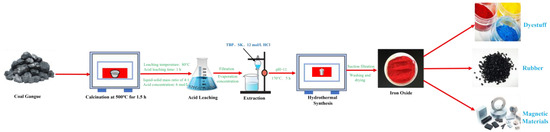 A schematic diagram of the mechanism of coal gangue roasting and activation–acid iron removal–extraction–hydrothermal synthesis of iron oxide red.