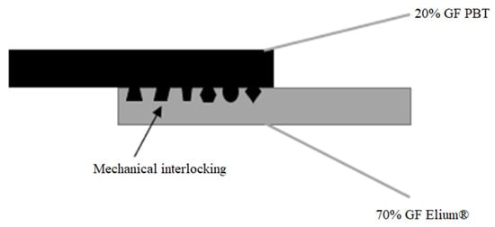 The present study focuses on the combination of Elium® composites prepared via RTM technology with PBT overmoulded part to produce the bi-component samples. The reason for choosing Elium® and PBT is twofold. Firstly, there is limited information on the combination of these two promising materials, which could potentially bring novelty and offer potential options for bi-component components and products used in the automotive and aerospace industries. Secondly, the combination of long glass fibre-reinforced Elium®, and short glass fibre-reinforced PBT has the potential to offer improved properties and mechanical performance that could be exploited in the above-mentioned industries. A variety of surface treatments, including solvent-induced swelling, plasma jetting, and sandblasting, have been used to gain a deeper insight into the effect of the chosen surface treatment process. In this way, the work presented focuses on the in-line assembly of long glass fibre composites and short glass fibre-reinforced engineering materials via mechanical interlocking (see Figure 1) due to its convenience and ability to create strong bonds [], thus offering competent mechanical performance for the finished bi-component products and structures, potentially usable in various means of transport interior wall assembly or wind blade mounting.