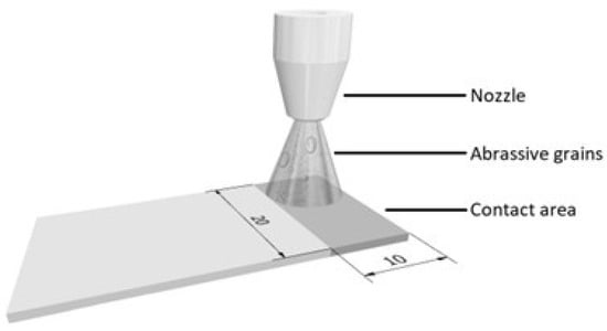- Sandblasting—A surface modification process in which abrasive particles are propelled against the surface of a treated substrate to alter its surface properties and improve adhesion for subsequent processes, such as coating or bonding. Here, an SBC420 instrument (Reno-Tech s.r.o., Kaznejov, Czech Republic) was used to perform comprehensive abrasive treatment on the Elium® substrate. The abrasive material used was slag (composition 30% SiO2, 40% AlO3;, and 30% CaO), with an average grain size of 120 µm (Sandblasting II) and an average grain size of 400–500 µm (Sandblasting I). The process was carried out at a pressure of approximately 0.2 MPa, with a substrate-to-nozzle distance of 8–10 cm at a perpendicular angle to the substrate surface for 30–40 s. The process is illustrated in Figure 3. The aim was to achieve variations in surface roughening, modification of mechanical interlock, and enhanced adhesion.Figure 3. Schematic of sandblasting for Elium® insert.