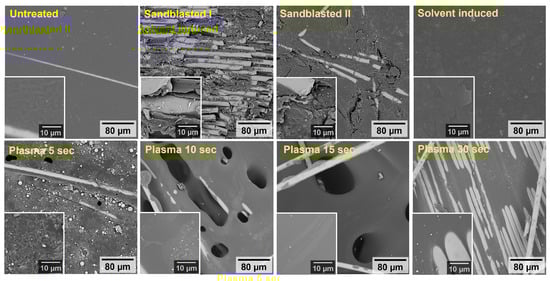 The surface microstructures of the Elium® inserts, as recorded using SEM, are shown in Figure 5. While only trivial changes in the surface morphology were observed for the Elium® inserts after solvent-induced treatment, the surface roughness of the sandblasted and plasma-treated inserts increased significantly. The grain size of the slag was smaller and, therefore, less aggressive for sandblasting II (average grain size of 120) compared to the larger average grain size used for sandblasting I (400–500 µm). In fact, sharp scratches and coarse erosion of the insert surface were observed for sandblasting I, in contrast to the milder eroded plates for sandblasting II. Furthermore, it can be observed that the plasma treatments resulted in a rather smooth removal of polymer material from the insert surface. Obviously, the longer the treatment, the more the polymer material is removed from the surface. This is due to the fact that increasing the plasma exposure time weakened the surface layer due to the higher energy involved, allowing the exposed glass fibres to emerge from the Elium® surface. It should be emphasised that 30 s of plasma exposure not only resulted in fibre purging with an increase in the areas with clear stripped fibres (see Figure 5 and Figure 6) but also resulted in a reduction in the final bond strength. It should also be noted that the fibre surface after plasma treatment was clear and smooth, whereas after sandblasting, residual traces of the Elium® matrix were observed, thus offering the potential for improved adhesion to the overmoulding material.