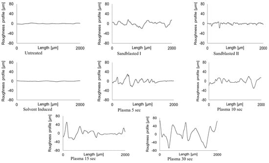 Surface roughness profiles of the Elium insert surfaces for Untreated and other treated samples, namely Sandblasted I, Sandblasted II, Solvent-induced, Plasma 5 s, Plasma 10 s, Plasma 15 s, and Plasma 30 s, obtained through contact profilometry.