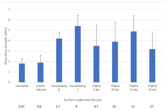 In general, adhesion is strongly influenced by the morphological surface pore size and roughness. These variables can be altered by modifying the thermoplastic melt at the micron-scale roughness level of the substrate []. The presence of a rough topography increases the total area at the interface, facilitating polymer flow into the voids of the substrate (see Figure 1). While a graphical representation of the roughness profiles of treated substrates can be seen in Figure 6 and Figure 7, the relationship between surface roughness and defined shear strength can be checked in Figure 8. The exact surface roughness values obtained from profilometry experiments are given in Table 2.