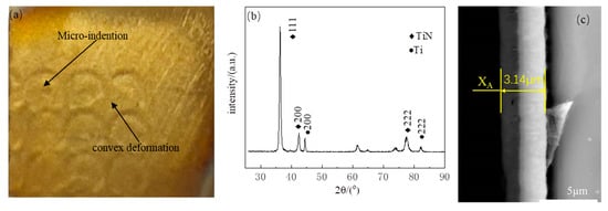 (a) The TiN coatings deposited on the substrate; (b) XRD pattern of TiN coatings; (c) the cross-section morphology of TiN.