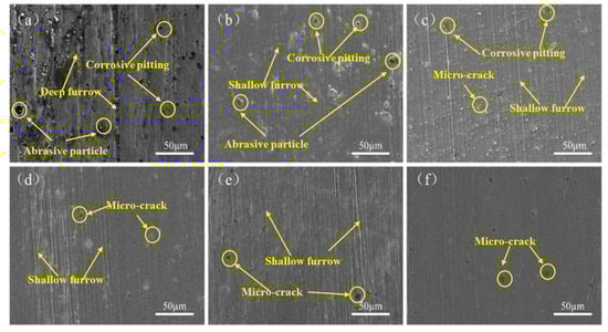 The wear status of samples A1–A5 is presented in Figure 9b–f. The wear morphology of the A1 sample, as illustrated in Figure 9b, demonstrated that the scratch was shallow and the wear condition was improved in comparison to that of the untreated sample. Nevertheless, a small area of peeling remained. Figure 9c depicts the wear morphology of sample A2. It can be observed that the surface wear was relatively minor, with the appearance of shallow furrow-like wear marks. It was observed that the coating surface exhibited evidence of abrasive wear. The wear morphology of samples A3 to A5, as illustrated in Figure 9d–f, exhibited a similar pattern. The worn surface exhibited a continuous and smooth appearance, with a notable reduction in the number of peeling and micro-pits, and the presence of only a few micro-cracks on the surface.