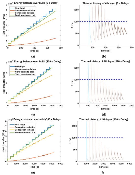 (a,c,e) The plots showing energy balance over the build for three distinct interpass dwell time. The total energy input, the dissipated energy, and the contributions of different modes of heat transfer to the energy transferred out are highlighted. (b,d,f) Thermal histories of the fourth layer in wall specimens are illustrated for three interlayer delay conditions. The horizontal broken line at 1000 C indicates the -transus temperature of Ti-6Al-4V used in the thermal model.