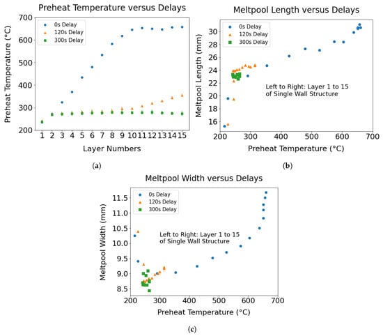 (a) The effect of interlayer delay on heat accumulation is demonstrated by plotting the evolution of preheat temperature of individual layers in the wall as a function of delay; (b,c) The evolution of the melt pool length and width over the deposition is highlighted by capturing the variation in the melt pool dimensions of individual layers during the deposition of the wall specimens made with distinct interlayer delays.