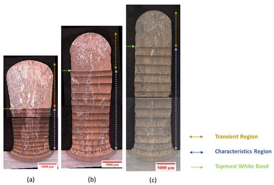 Figure 5 shows a montage of an optical micrograph of the cross-section of the wall structures fabricated maintaining different delays between layers during deposition. The typical characteristic region, transient region, and white bands are highlighted in the optical images. These features are defined as follows: the parallel and horizontally oriented lighter features observed in the cross-sectional image of a wall structure under the optical microscope are called white bands. The white bands and their spacing are related to thermal phenomena, and the mechanism of the formation of white bands is explained in Section 4.1. The characteristic region is defined as the area enclosed by the base plate and the topmost white band. In this characteristic zone, a repeated pattern of a white band followed by a darker region is observed. The location of the white bands is not associated with the layer positions as such. The region located above the topmost white band is called the transient region. The individual beads can be distinguished by the curvature present at the edges of the cross-sectional images of the wall components. The coarsening of the microstructure can be clearly identified from the bottom to the top, with much smaller grain sizes on the base plate. The grains are several millimeters wide in the horizontal direction and elongated in the build direction, which agrees with the epitaxial growth mechanism under conditions of vertical heat flow. Similar results were found in previous investigations with similar processing conditions [21,27,28].