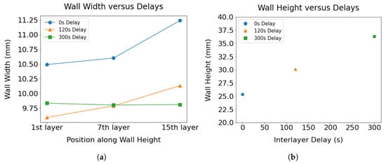 (a) Variation of wall width across the height captured for walls as a function of interlayer delays. (b) The height of the three walls with different delays measured from the deposition end point are compared to demonstrate the effect of heat buildup on the wall dimensions.
