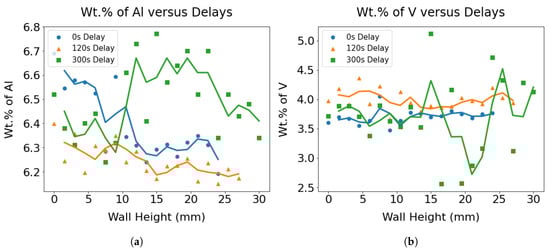 The changes in composition are captured via the variation of (a) wt.% of Al and (b) wt.% of V across the wall height for three wall specimens with different delays.