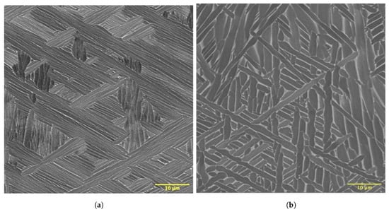 The microstructural features of as-built wall structures were investigated using scanning electron microscopy (SEM). Typical backscattered SEM images of the colony type and basket weave microstructures consisting of alpha and beta phases are shown in Figure 8a and Figure 8b, respectively.