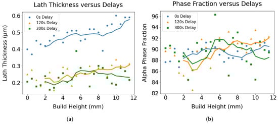 When lath thickness values were plotted as a function of build height up to 15 mm considering only the characteristic regions (Figure 9a), an increasing trend of lath thickness with increasing build height was observed for all three samples. The degree of coarsening of lath thickness was more prominent for the wall made without delay, which can be ascribed to the decelerated cooling rates caused by the accumulation of heat. Moreover, the shortest delay resulted in a higher average lath thickness, suggesting relatively coarser microstructures. This is because the layers experience consistently higher temperatures throughout the build duration without delay, in contrast to when a prolonged delay is implemented. For example, the estimated temperature profiles of the fourth layer for 0 s, 120 s and 300 s delays depicted in Figure 3b,d,f demonstrate that the overall temperature of the 4th layer for the wall without dwell time sustained higher temperatures during the deposition process compared to walls with extended delays.