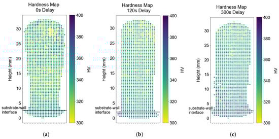 Vickers microhardness mappings were acquired to quantify the variation in the mechanical properties within the wall components, correlating with interlayer delay. The hardness maps in Figure 10 highlight the variation in hardness along the build height on these wall structures. This variation can be attributed to the coarsening of the lath thickness along the build direction, as shown in Figure 9. The hardness map with a longer delay appears to have uniform hardness values along the wall height owing to the (effectively) uniform cooling rates as a function of height.