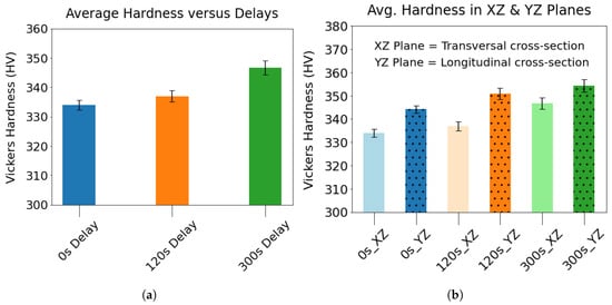Figure 12a highlights that a longer delay leads to a higher average hardness in these Ti64 wall components. Approximately a 4% increase in average hardness was observed when the interlayer delay increased from 0 to 300 s for these Ti64 wall components. The anisotropic mechanical behavior of Ti64 was captured by measuring the hardness in the XZ and YZ planes of the walls (Figure 12b). The hardness of the YZ planes was found to be higher than that of the XZ planes for all three samples. This observation is in agreement with the existing literature [33,34,35]. The hardness variation in different cross-sectional planes can be explained by the crystallographic orientation of the underlying phase in them. In an experimental study, Viswanathan et al. [36] found that the hardness obtained by nanoindentation on the grains presenting the basal plane exhibited 50% higher hardness than the grains presenting the prism planes.