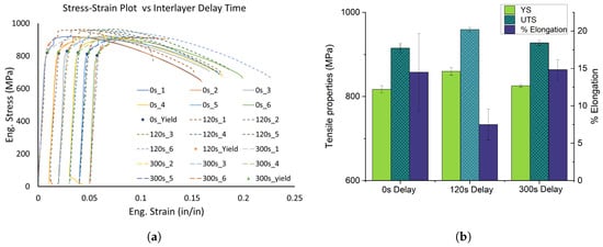 (a) The stress–strain plots of the three wall samples with distinct interlayer delays. A total of six samples were tested for each delay, and the tensile curves are plotted with an offset of 1% strain for visual clarity. (b) The bar plots illustrating the tensile properties as a function of interpass dwell time.