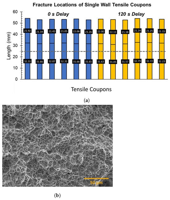 (a) The bar plots showing fracture locations of tensile coupons tested from single-wall structures made with 0 and 120 s delays. The grey dotted line represents the wall–substrate interface, whereas the solid black line indicates the fracture location in the tensile coupon. The length of the broken halves of the tensile coupon is also highlighted in the bar plots. (b) SEM micrograph of a fracture surface of the tensile coupon illustrating the ductile failure mechanism for these single-wall tensile specimens.