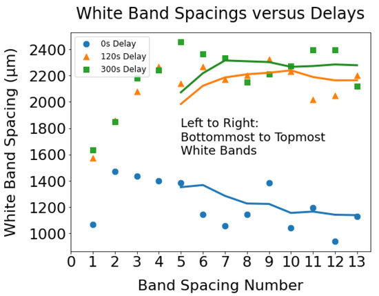 The white band spacings in the walls with distinct delays demonstrating that the white bands closely spaced in the wall with the shortest interlayer delay. The solid lines representing the moving average of white band spacings illustrate that the gaps between bands progressively reduce with increasing wall height for 0 s delay.