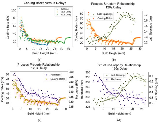 (a) Variation of cooling rates across the wall height is shown for three distinct interlayer delays. A pronounced decrease in cooling rates was observed up to a wall height of approximately 7.5 mm, regardless of the delay. Subsequently, the reduction of cooling rates slowed down with delays of 120 and 300 s, while they continued to decrease progressively with increasing height in the case of no delay. (b–d) Plots highlighting the relationship between cooling rates & microstructure, cooling rates & property, and microstructure & property for 120 s delay. These graphs demonstrate the process-structure-property relationship forged in this study. The solid lines in the figures indicate the moving average.