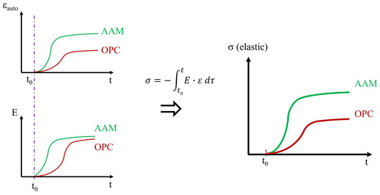 Many compositions studied in the literature have demonstrated numerous advantages, such as high early strength [6], good fire resistance [7], and improved resistance to chemical attack [8]. However, alkali-activated materials often suffer from significant shrinkage. This is because, unlike OPC concrete, which typically sets in four to eight hours for a water-to-cement ratio (W/C) between 0.3 and 0.4 [9], alkali-activated materials usually set faster, depending on the alkali content [10]. AAMs exhibit higher shrinkage (autogenous and drying) on longer duration and develop faster E-modulus with similar magnitude (see Figure 1). Consequently, when the material is used in restrained conditions, it may lead to early-age cracking due to the tensile stress build-up. This must be avoided to ensure the durability of concrete structures [11,12,13,14].