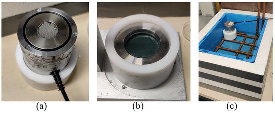 The internal relative humidity (IRH) is measured using HC2-AW water activity probes, as illustrated in Figure 2a, which are calibrated with different salt solutions with known relative humidities. The pastes are cast in plastic cylinders (Ø43 mm), sealed, and placed in a thermostatically controlled box maintained at (20 ± 0.1) °C, as depicted in Figure 2b,c. The measuring accuracy of the probes is ±1%.