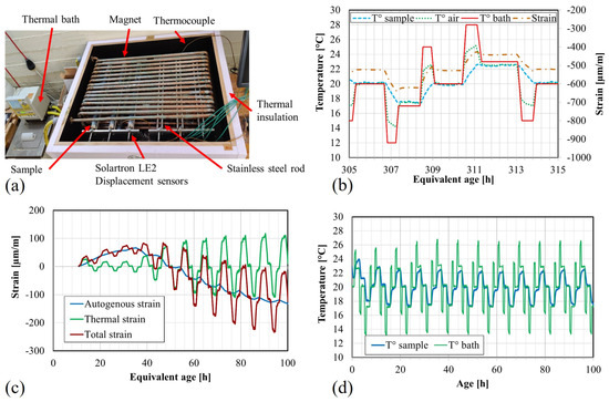 AutoShrink explanation: (a) AutoShrink device developed at ULB [38] (modified); (b) example of temperature variations [38]; (c) example of measured strains; (d) example of temperature history.