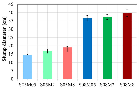 The workability of the paste is assessed using the ASTM cone (ASTM C230 [47]). Within 5 min after mixing, the workability is evaluated by measuring the average diameter of the paste disc, with a measuring error of 5 mm. The mean slump diameter obtained from different tests, along with the standard deviation, will be reported in the results. For S05M05, S08M2, and S08M8, 4 measurements were performed, while for S05M2, S05M8, and S08M8, 6 measurements were carried out. As the hardening process advances, both the diameter and workability decrease over time. However, as the primary focus of this work does not encompass mechanical properties, a flowability test over time has not been carried out. This method is employed to ensure the repeatability of the mixing throughout the entirety of the testing campaign.